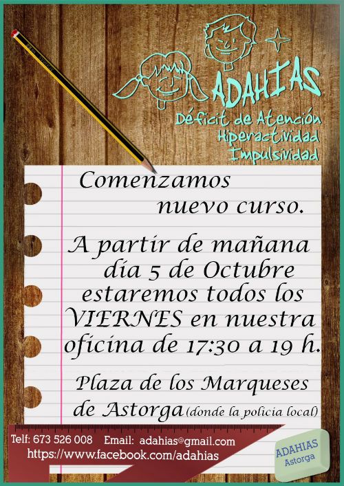 La asociación Adahias, dedicada a los afectados por el trastorno de déficit de atención con o sin hiperactividad, retoma la actividad con el nuevo curso. Todas las personas que necesiten de sus servicios de asesoramiento y quieran participar en sus actividades pueden dirigirse los viernes a la sede del colectivo (Plaza de los Marqueses de Astorga) en el horario habitual de 17:30 a 19 horas. También se puede solicitar cita, ya sea por correo adahias@gmail.com o en el teléfono 673 526 008.